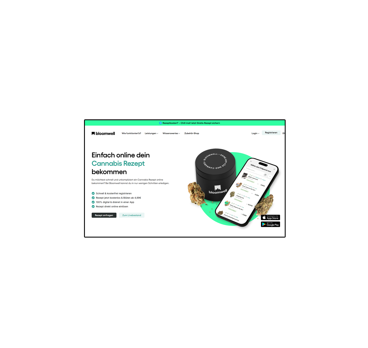 Bloomwell ist ein innovativer Anbieter, der es ermöglicht, medizinisches Cannabis einfach und schnell per Online-Rezept zu erhalten. Der gesamte Ablauf – von der Registrierung bis zum Rezept – läuft digital ab und kann in wenigen Minuten starten.